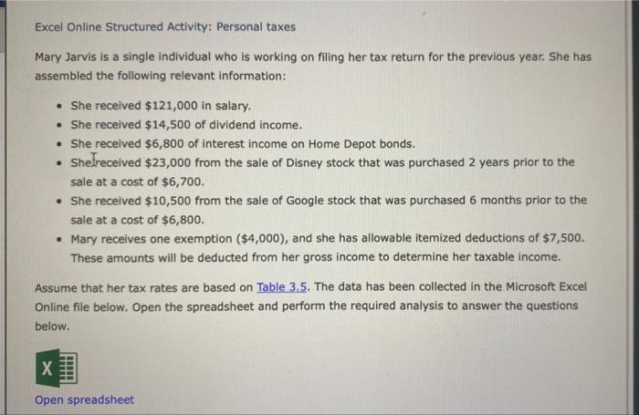 Solved Excel Online Structured Activity Personal Taxes Mary Chegg Com